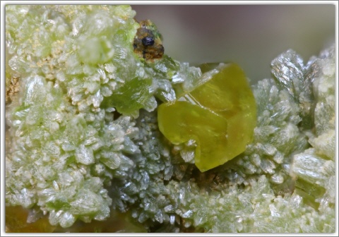 Agardit-(CE) xx auf Quarz, Santa Lucia/Sardinien, Bildbreite 6 mm